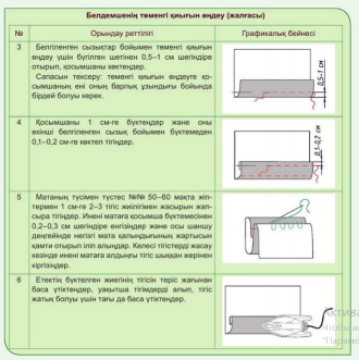 3 сағат. Пратикалық сабақтың жалғасы. 4. Тігін мәшинелерін қолдана және технологиялық реттілікті сақтай отырып, өзгертілетін бұйымның жеке бөлшектері мен бөліктерін өңдеу және біріктіру операцияларын орындаңдар. 5. Сәндеу үшін әрлеу материалдары мен фурнитураны қолданыңдар. 6. Тігу барысында қажетті құрал-жабдықтарды таңдай отырып, ЫЖӨ операцияларын орын- дандар.