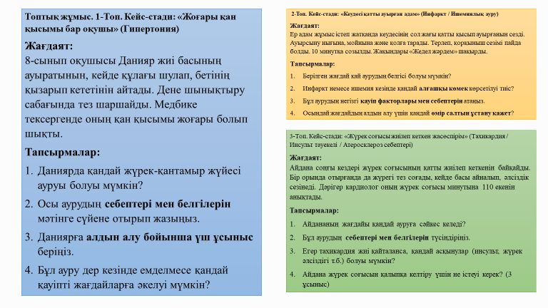 Мұндағы: — гипотенуза (ең ұзын қабырға) — катеттер Негізгі идея: Пифагор теоремасы арқылы біз ең қысқа қашықтықты, денедегі кеңістіктік жолдарды, сондай-ақ қанның жүретін бағытын модельдеуге болады. 2. Қан тамырлары(қысқаша видео сабақ) Артериялар – қанды жүректен алып шығады. Веналар – қанды жүрекке әкеледі. Капиллярлар – зат алмасу өтетін өте жіңішке тамырлар. 3. Жүрек-қан тамыр аурулары туралы теория 1. Қан қысымы (артериялық гипертензия) Қан тамырлары тарылса → қан қысымы көтеріледі. Тамырдың “жол ұзындығы” мен “қарсылығы” артқан сайын жүрекке салмақ көбейеді. 2. Атеросклероз Тамыр қабырғаларында холестерин жиналып, тамыр тарылады. Салдары: қан айналымы нашарлайды; қан мүшеге баяу жетеді; жүрекке артық күш түседі. 3. Ишемиялық жүрек ауруы Жүрекке баратын негізгі артерия (коронарлық артерия) тарылғанда немесе бітелгенде пайда болады. Жүрек жеткілікті оттегі ала алмайды. Жанама (коллатеральді) жолдар маңызды рөл атқарады. Веналардағы қанның баяу жүруі Қан тамырларындағы клапандардың әлсіздігі Қанның түйіршектеліп бітелуі үлкен қауіп төндіреді. |