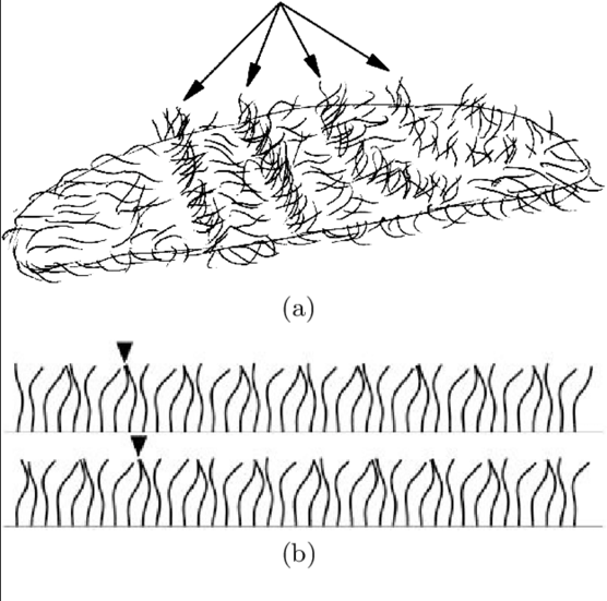 (b) Эпителий бетінде орналасқан кірпікшелердің соғу фазалары: жоғары қатар – тиімді соққы; төменгі қатар – қалпына келу соққысы.