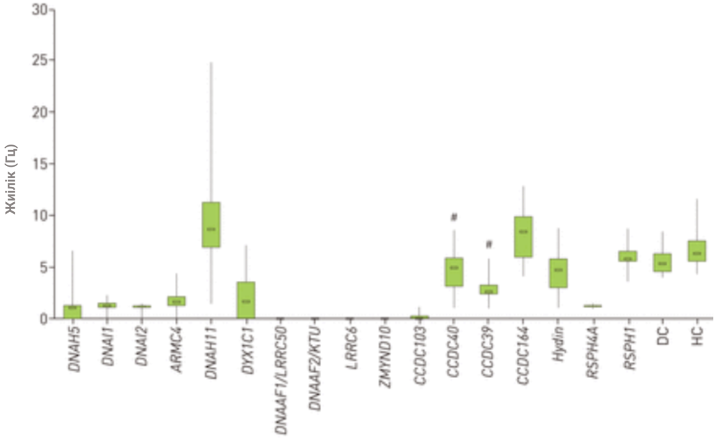 2-суретте кірпікшелер соғу жиілігінің генетикалық ақауларға тәуелді өзгеруі көрсетілген. Сау бақылау тобында жиілік жоғары және тұрақты, ал кейбір мутацияларда көрсеткіш айқын төмендеген. Бұл муксоцилиарлық тасымалдың әлсіреуіне әкелетінін дәлелдейді.