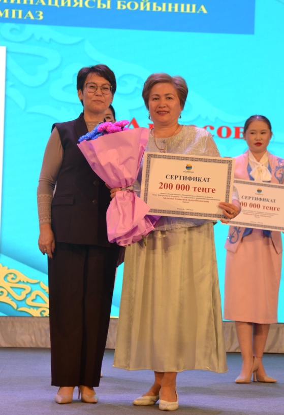 Келесі кезекте тілге қатысты түрлі байқаулардың жеңімпаздары марапатталд ы. Маған Ақмола облысы әкімінің «Тіл жанашыры» сыйлығының Ахмет Байтұрсынұлы атындағы «Тіл майталманы» номинациясының жеңімпазы атану бағы бұйырды. Екі жүз мың теңге көлемінде ақшалай сертификатпен марапатталдым.