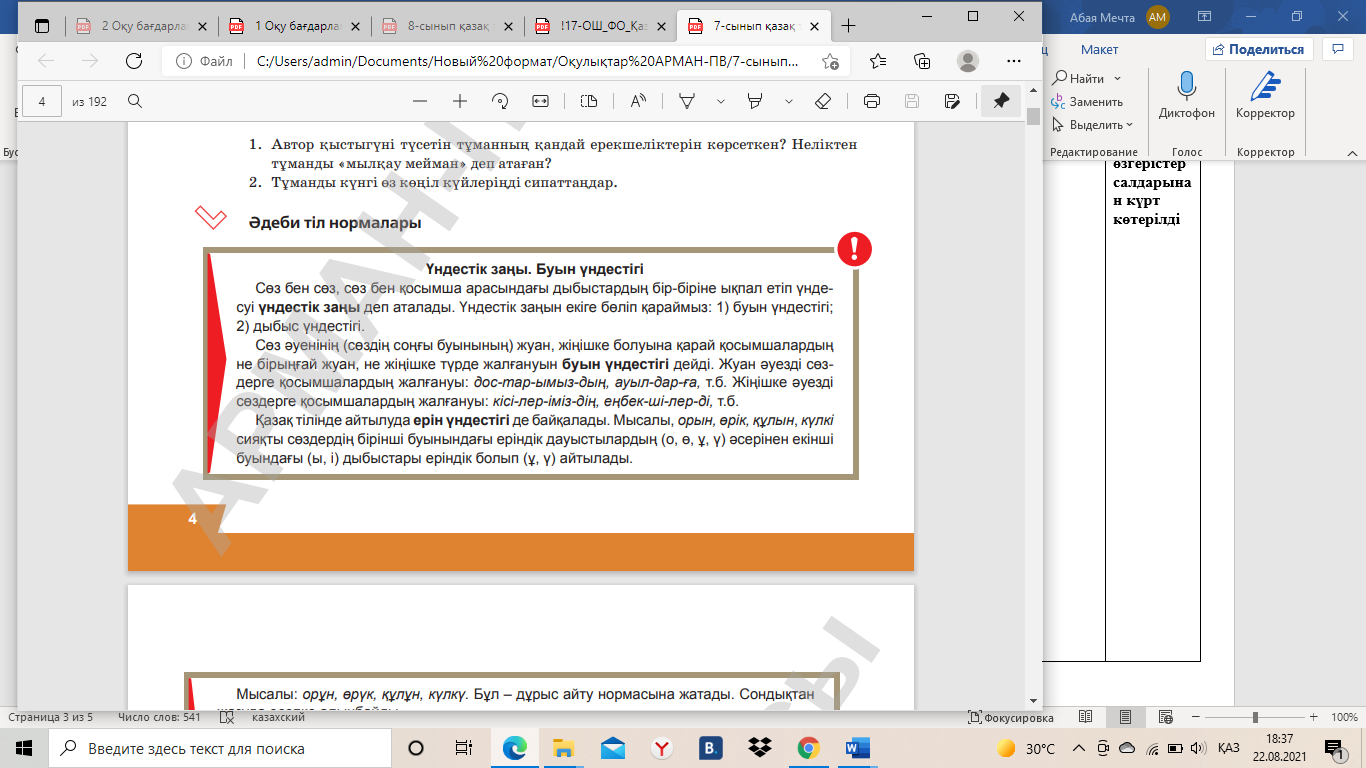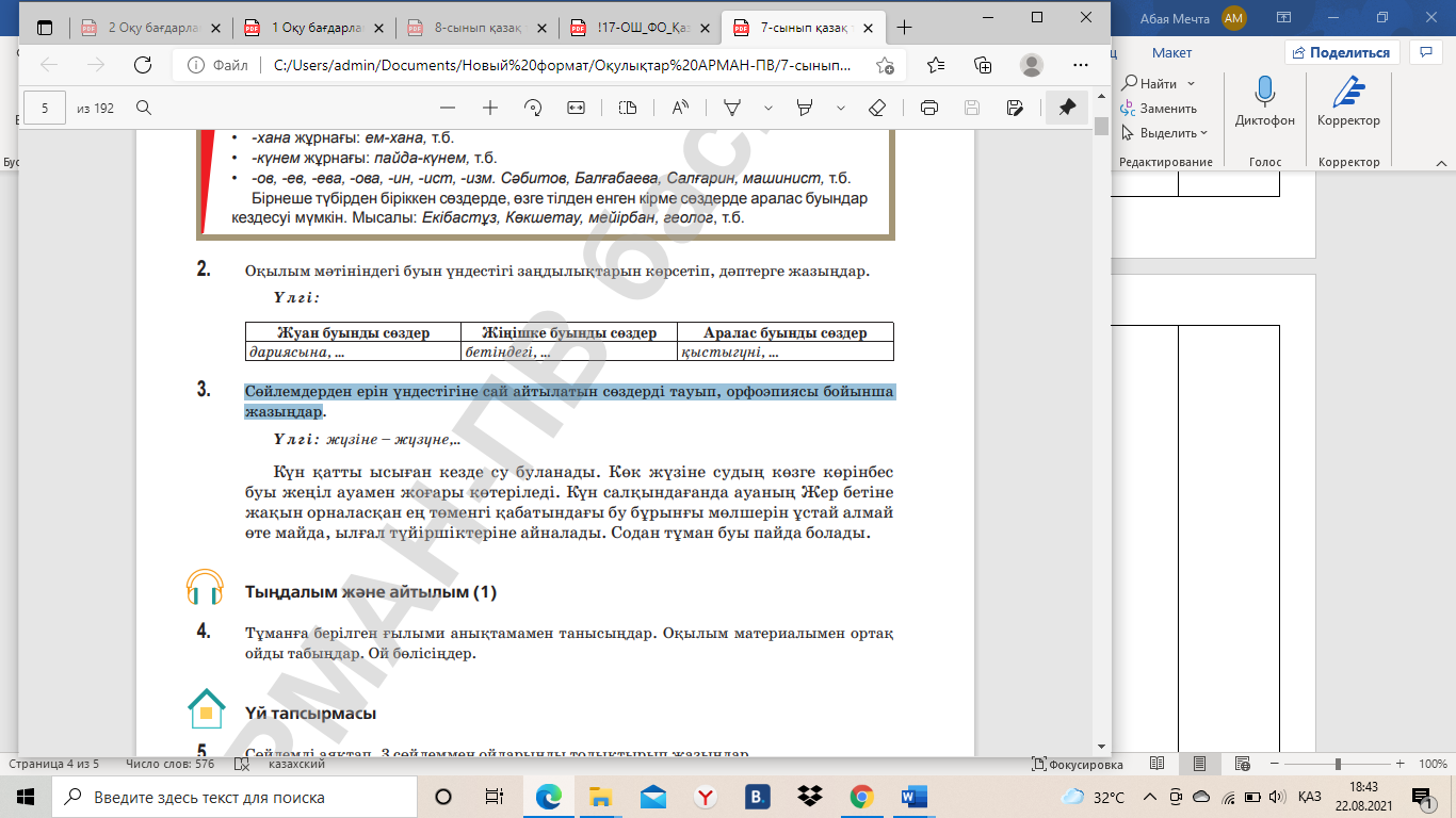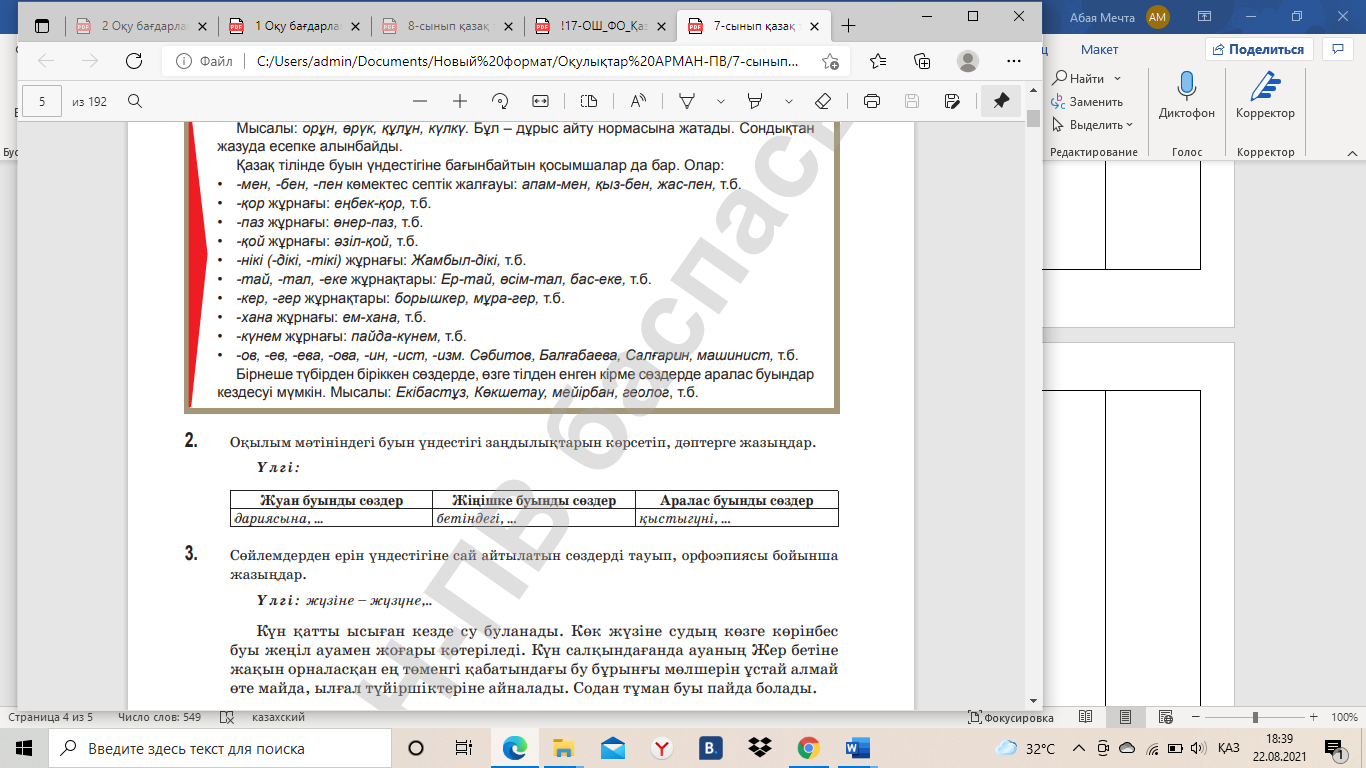 2-тапсырма. Оқылым мәтініндегі буын үндестігі заңдылықтарын көрсетіп, дәптерге жазыңдар.