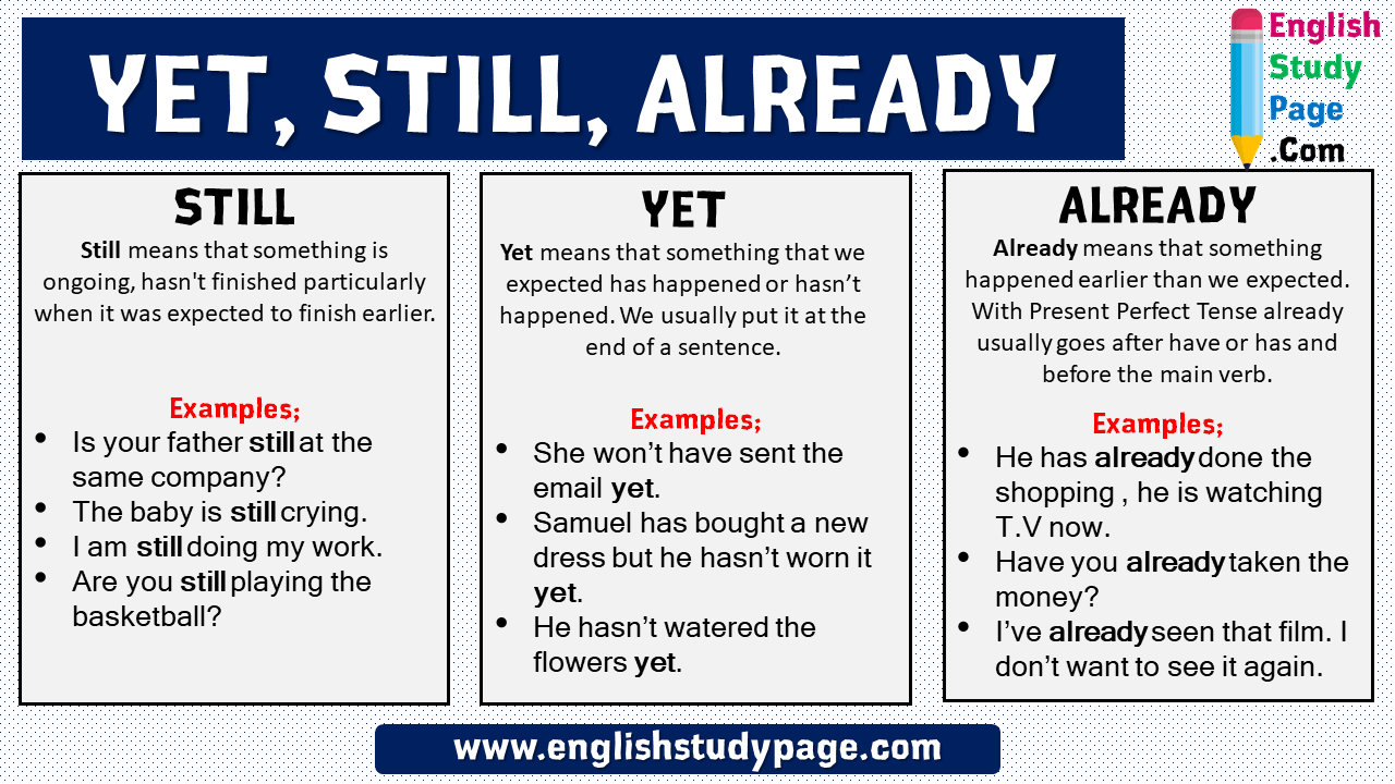 Descriptor: - complete the sentences from the text - match sentences with a or b Total: 2 point Descriptor: - complete the rules with still, just, yet and already. Total: 2 point Descriptor: - order the words to make sentences Total: 2 point Descriptor: - write answers for the questions with still, yet, just and already Total: 2 point -Make CCQ questions Yes / No Total: 10 point Descriptor: - listen to six dialogues - use still, yet, just and already Total: 2 point |