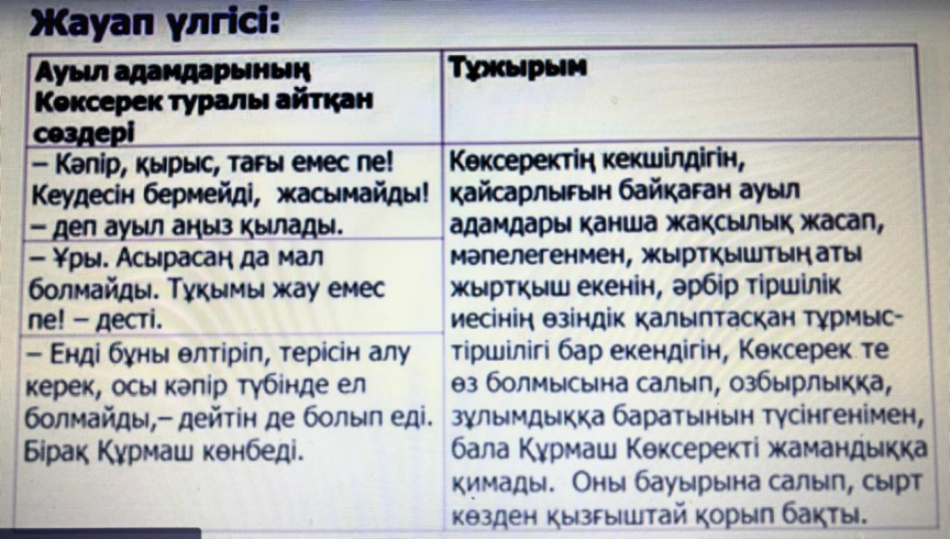 Шығармадан ауыл адамдарының Көксерек туралы айтқан сөздерін теріп жазып, ой тұжырымдай ды.