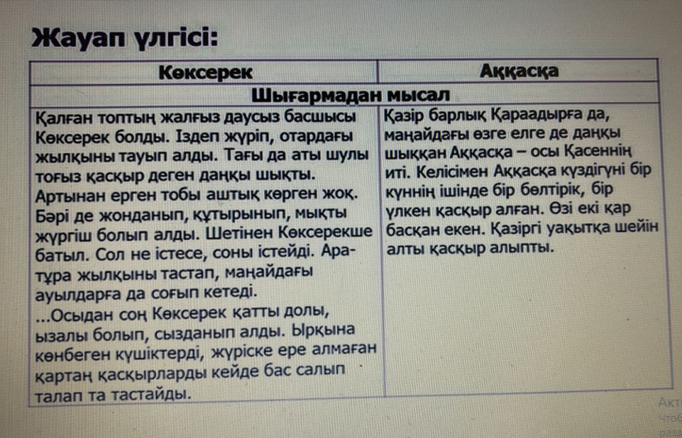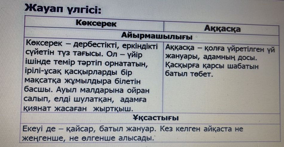 4-тапсырма. Көксерек пен Аққасқаның бейнесін салыстырып, шығармадан мысал келтіріңіз.