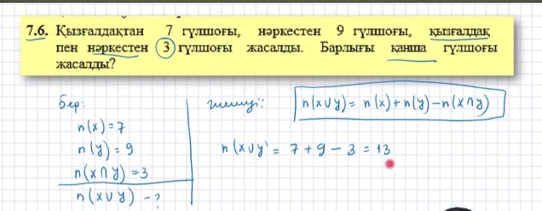 Егер Х және У жиындарының ортақ элементтер саны с ,Х жиынында a элемент, У жиынында b элемент болса , онда Х және У жиындарының бірігуі (a+b) - c элементтен тұрады.