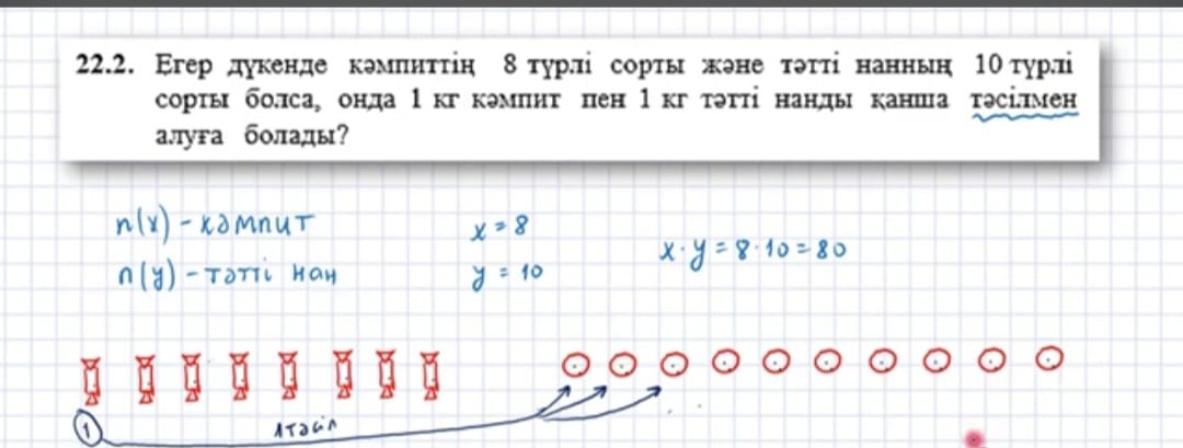 Егер дүкенде кәмпиттің 8 түрлі сорты және тәтті нанның 10 түрлі сорты болса, онда 1 кг кәмпит пен 1 кг тәтті нанды қанша тәсілмен алуға болады?