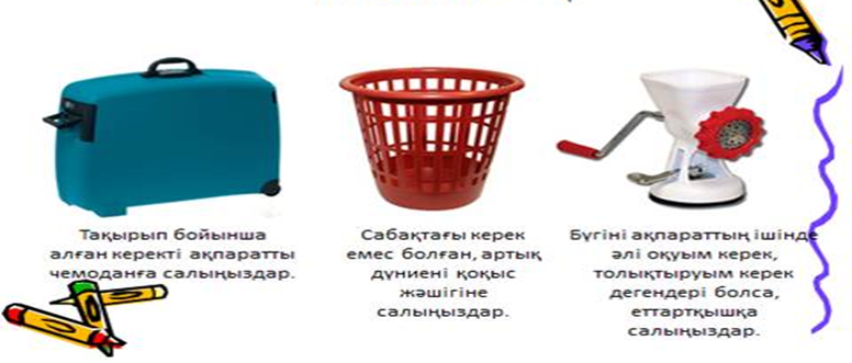 Мақсаты: тақтадағы суреттер бойынша оқушылар өзімен бірге бүгінгі сабақтан қандай білім, білік, дағдыны алып кеткісі келетінін, толықтыратынын немесе керек емес ақпарат туралы пікірлерін стикерге жазады.
