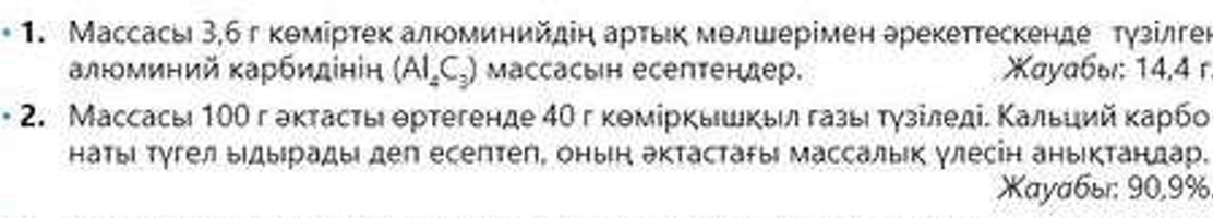Дескриптор: көмірқышқыл газын алуға болатын әртүрлі типтегі екі реакция теңдеуін жазады; Жалпы балл-2 Дескриптор : оксидтерден металдарды алу реакцияларының теңдеулерін жазады. Жалпы балл-2 Дескриптор : түзілген тұздың массасын есептейді; әктастың массалық үлесін есептейді; Жалпы балл-4 |