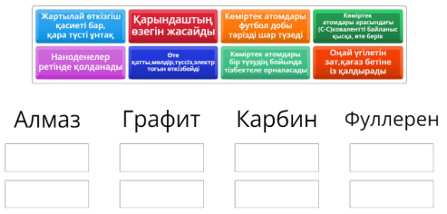 Дескриптор: Алмазға тән белгілерін анықтайды. Графитке тән белгілерін анықтайды. Карбинге тән белгілерін анықтайды. Фуллеренге тән белгілерін анықтайды. Барлығы -2балл |