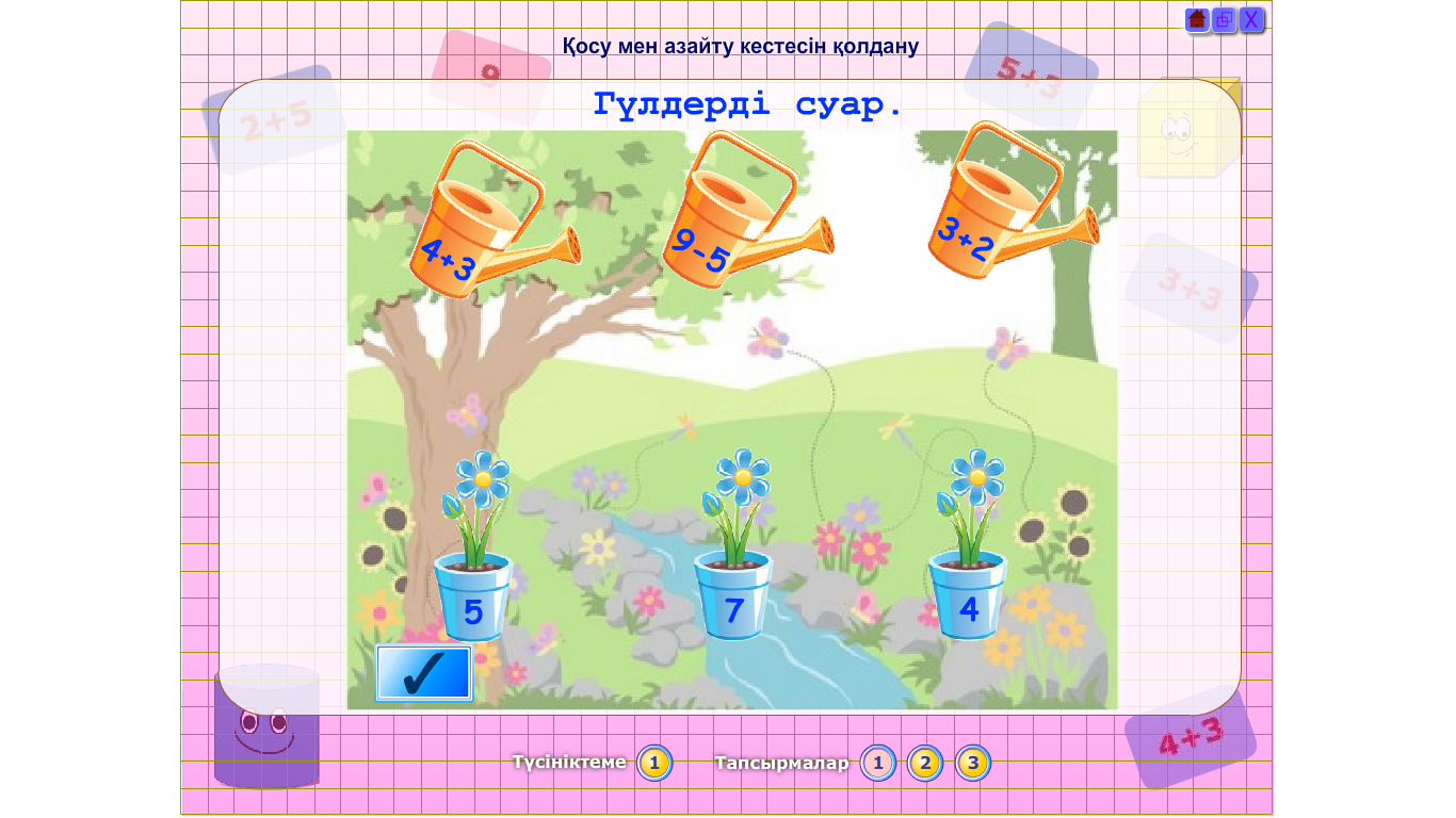 Шарты:Сандарды қосу және азайту амалдарын орындап,гүлдерді суар.