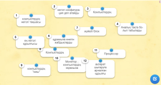 Оқушылар тапсырманы топпен бірігіп орындайды, талдап, түсіндіреді. Дескриптор: Компьютер конфигурациясын таңдауды біледі – 1б Компьютердің ішкі құрылғыларын атап,көрсете алады- 1б Компьютердің сыртқы құрылғылары жайлы түсіндіреді- 1 балл