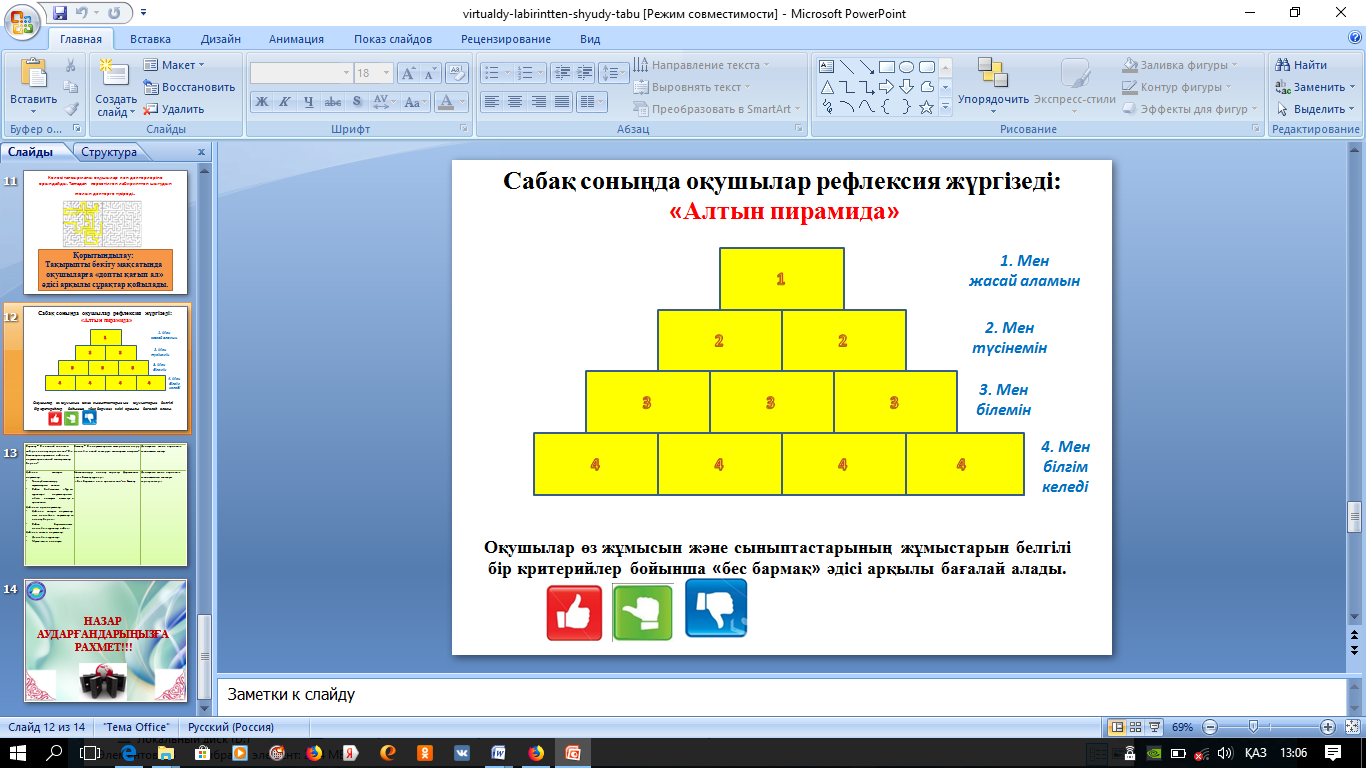 Сабақтың соңында оқушылар «Алтын пирамида» әдісі арқылы рефлексия жүргізеді.