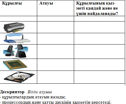 Компьютер қызметін және құрылғылардың қалай жұмыс жасау керектігін түсіндіре алады. Сөйлеу дағдылары қалыптасады. Лексика және терминология: Жүйелік блок, аналық тақша, орталық процессор, жүйелік шина атауымен танысады. Термин сөздермен танысады. Үш тілділік: Жүйелік блок – Системный блок - system unit Монитор – monitor Пернетақта – клавиатура - Keyboard Файл – Файл – File Бума – Папка – Folder Орналастыру – Вставить– Paste Жүктеу – Загрузить – Download |