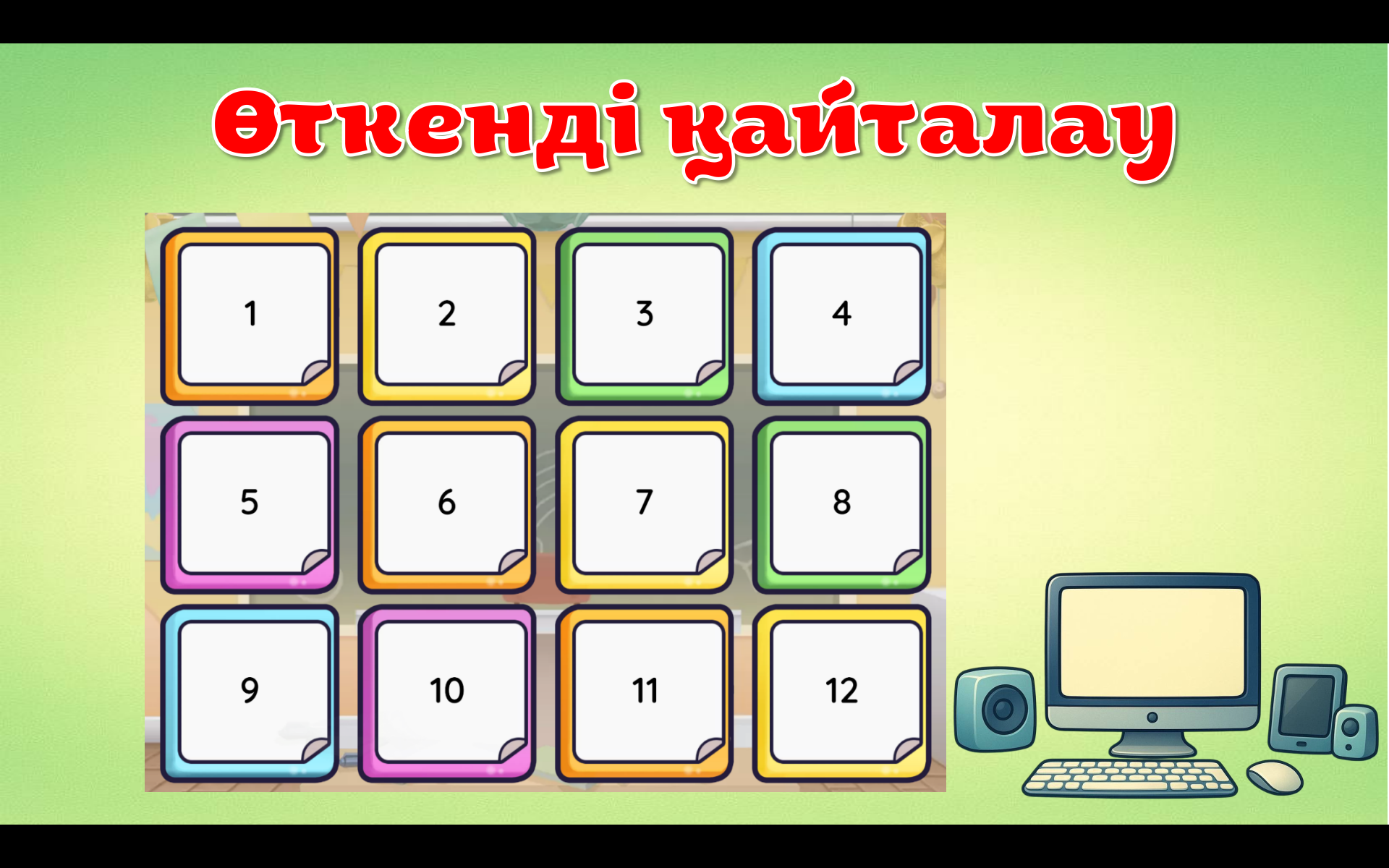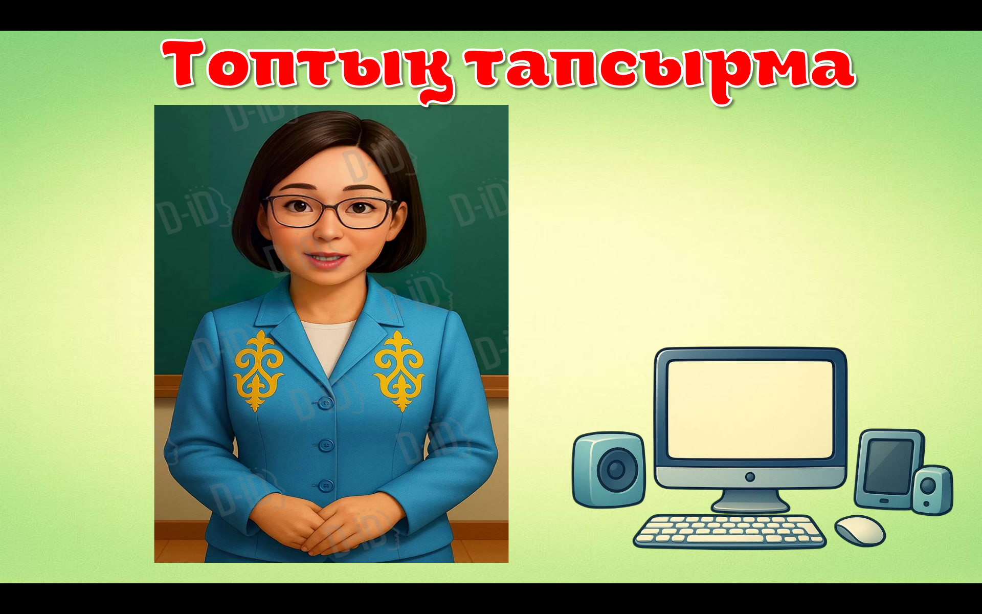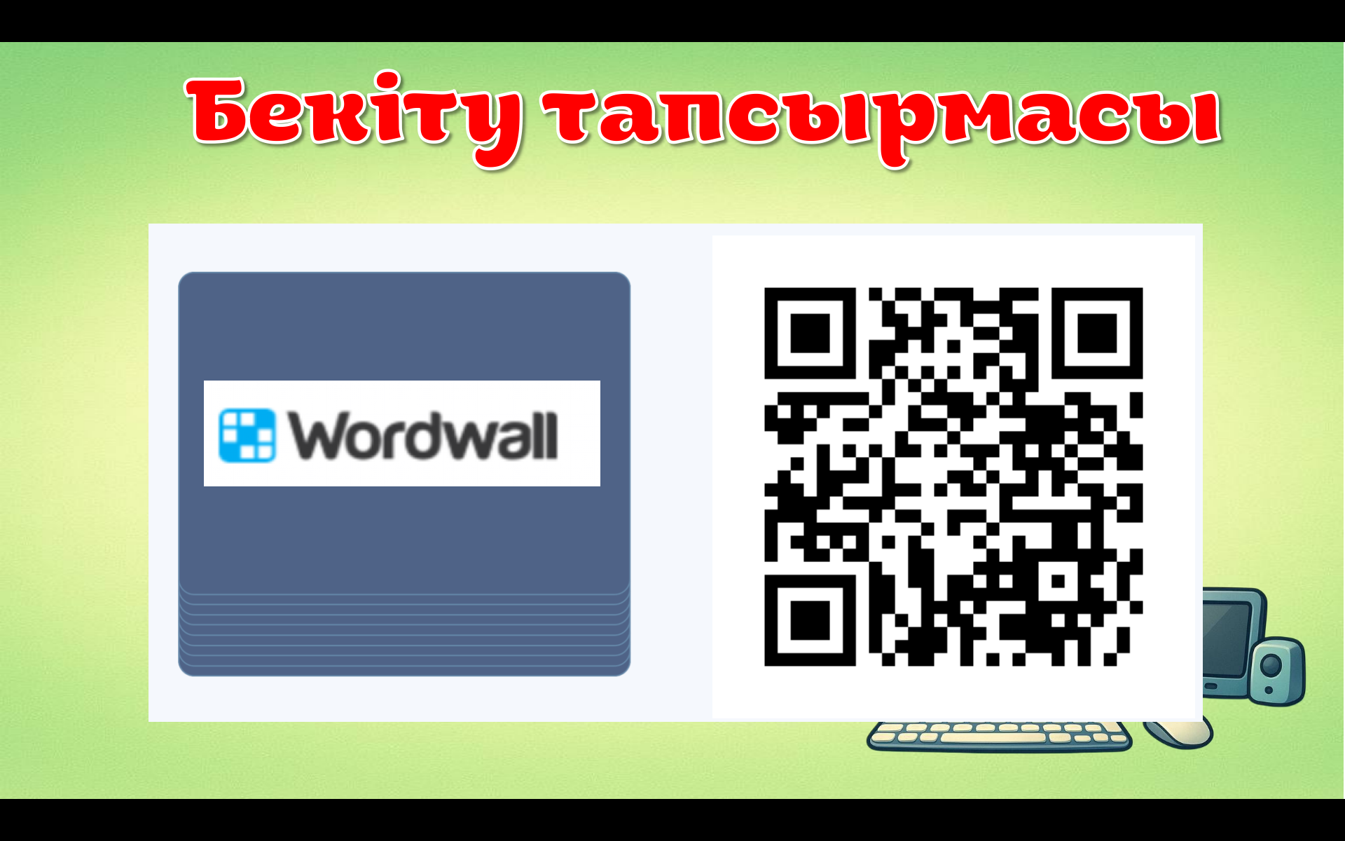 іс-қимылдар арқылы жасайды Бекіту тапсырмасы. https://wordwall.net/ru/resource/61929956 Wordwall платформасындағы тапсырманы орындау. Сұрақтарға жауап беру.