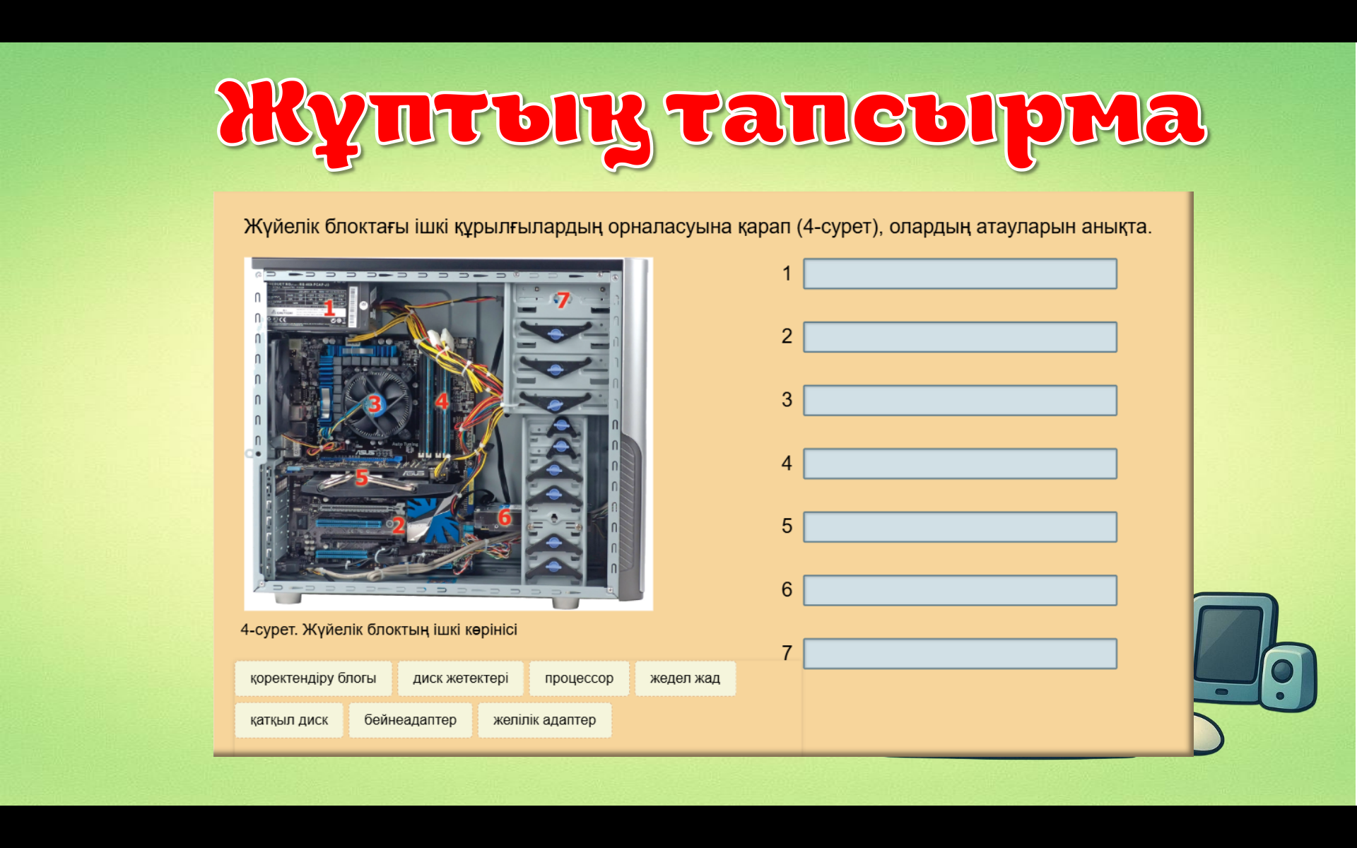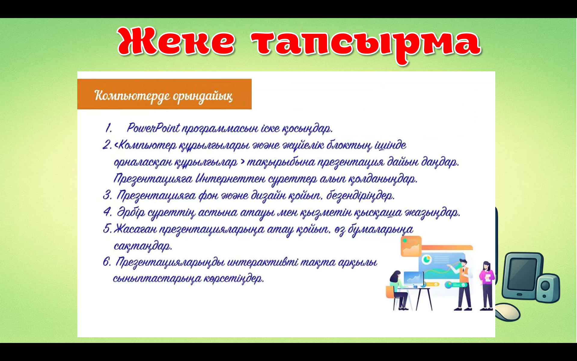 Дескриптор: -ЖИ бейнеролигін тыңдайды; - кестені толтырады. Дескриптор: - ксуретке қарап құрылғы атауларын дұрыс орналастырады Дескриптор: - power point программасымен жұмыс жасайды; - фон, дизайн қосады; - презентацияны жасап, ат қойып, сақтайды. “Мадақтау” әдісі Дескриптор: - суреттегі құрылғы атауын тауып, қызметі, орналасуы жөнінде айтады “Мадақтау” әдісі |