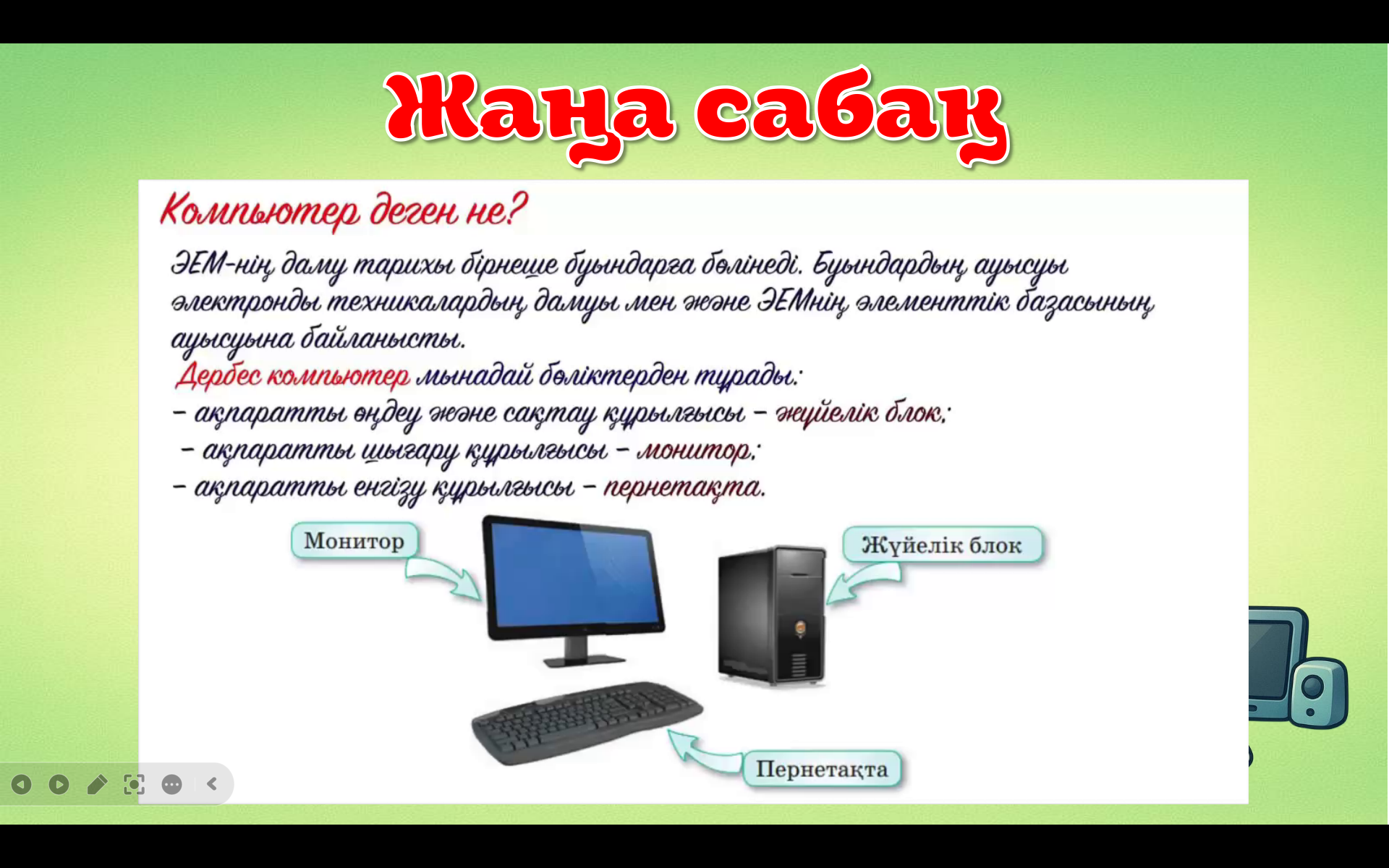 Компьютер (ағылш. computer — «есептегіш»), ЭЕМ (электрондық есептеуіш машина) — есептеулерді жүргізуге, ақпаратты алдын ала белгіленген алгоритм бойынша қабылдау, қайта өңдеу, сақтау және нәтиже шығаруға арналған құрылғы. Топтық жұмыс. ЖИ бейнеролигін тыңдай отырып, кестемен жұмыс жасау.