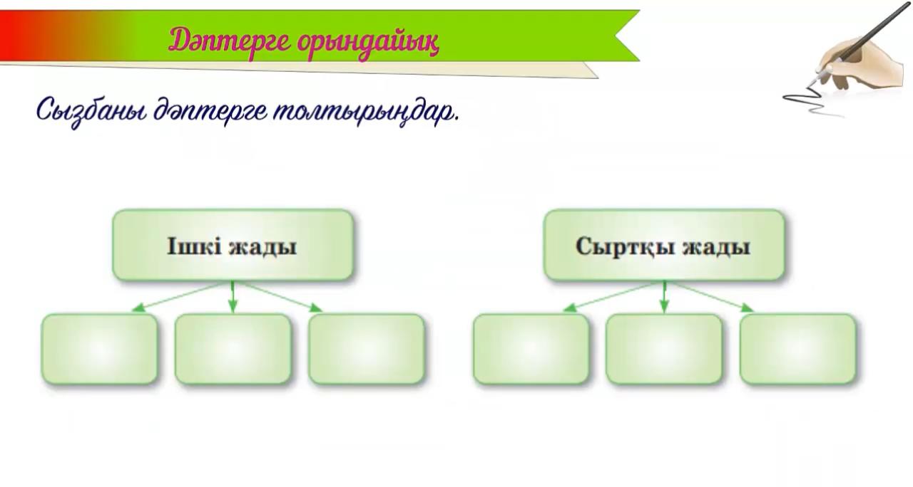 1.Мұғаліммен амандасады. 2.Сабақтың тақырыбын дәптерге жазады. 3.Сабақтың мақсаттарымен танысады. 4.Оқушылар пазл құрастыру арқылы үш топқа бөлінеді. 5.сызбамен танысады |