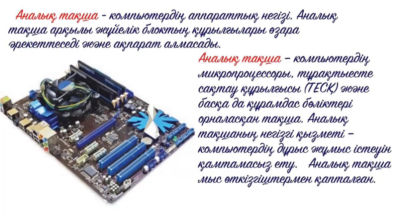 Компьютер құрылғыларымен танысады Жүйелі блоктың ішкі құрлымымен танысады Аналық тақша туралы біледі Компьютермен практикалық тапсырманы дескрипторға қарап орындайды |