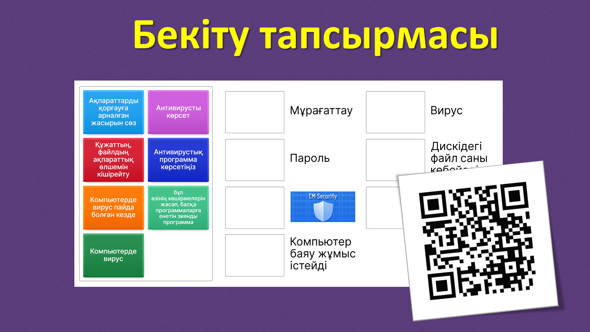 Бекіту тапсырмасы. wordwall. платформасында дайындаған сәйкестендіру тапсырмасын орындау.