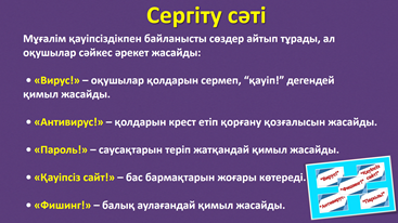 Жаңа тақырыппен танысады. Тақырапқа сай бейнеролик қарайды. Жаңа ақпараттар алады Қажетті анықтамаларды жұмыс дәптерлеріне жазып алады Оқушылар топпен бірігіп 3Д кубта берілген тапсырманы орындайды Балалар жұмыс парағы бойынша тапсырмаларды топпен орындайды - ақпаратты қорғаудың кем дегенде 3 тәсілін жазады Сергіту сәтін жасайды Компьютерде жеке тапсырманы орындайды Платформа-дағы тапсырм-аларды орындайды |