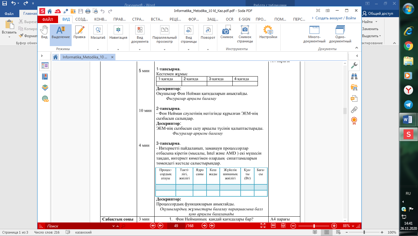 1. Фон Нейманның қандай қағидалары бар? 2. Заманауи компьютерлердің алғашқы компьютерден қандай артықшылықтары бар? 3. Процессордың ішкі құрылысын ата. 4. Процессордың негізгі құрылғыларының қызметін сипатта. 5. Арифметикалық-логикалық құрылғының міндеті не? Өздерін бағалайды 2.Кері байланыс: