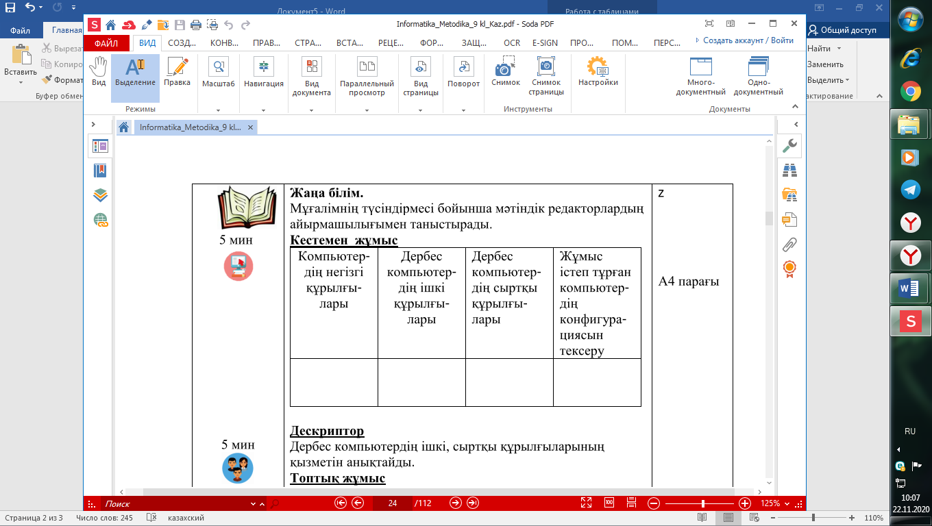 Дескриптор Дербес компьютердің ішкі, сыртқы құрылғыларының қызметін анықтайды. Пайдалану мақсатына қарай компьютерлердің конфигурацияларын таңдаңдар. Мақсатына қарай компьютер құрылғыларының техникалық сипаттамаларын анықтаңдар . Оқушылардың жұмыстары қоржынға фишкалар жинау арқылы бағаланады. Компьютерде орындайық тапсырмасын орындау: