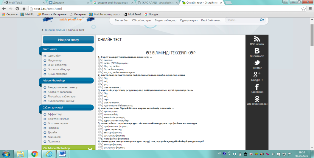 Онлайн тестілеуге келіп тоқталатын болсақ, бұл тестілеу арқылы оқытушы компьютерлік графика пәнінен Adobe Photoshop графикалық бағдарламасын қаншалықты деңгейде меңгергенін анықтап, бағалай алады.