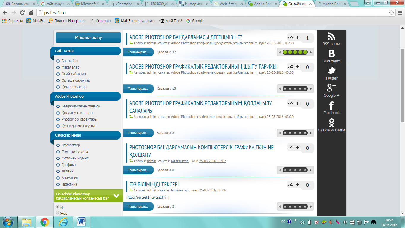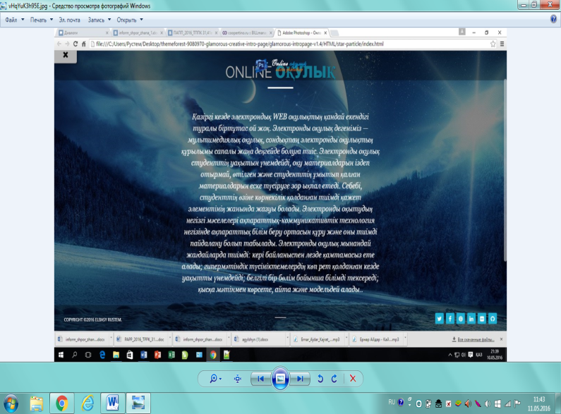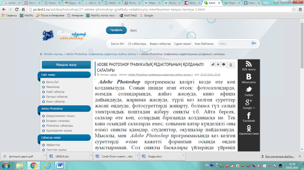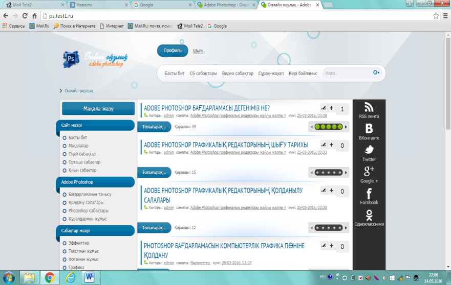 Сонымен біз бұл онлайн оқулықты компьютерлік графика пәнін оқытуда пайдаланумен қатар, өзге де дербес қолданушылардың Adobe Photoshop графикалық бағдарламасын ғаламтордан оқып үйренуіне мүмкіндік жасадық.