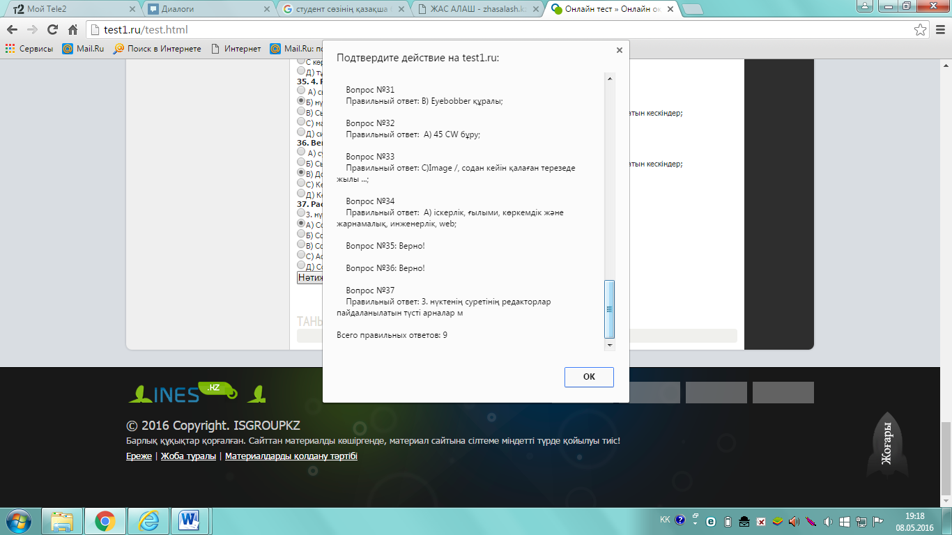 Соңында нәтижені тексеруге арналған батырма бар. Ол батырма арқылы дұрыс жауаптардың санын анықтауға және дұрыс жауап бермеген сұрақтарыңыздың жауаптарын білуге болады(Сурет 37).