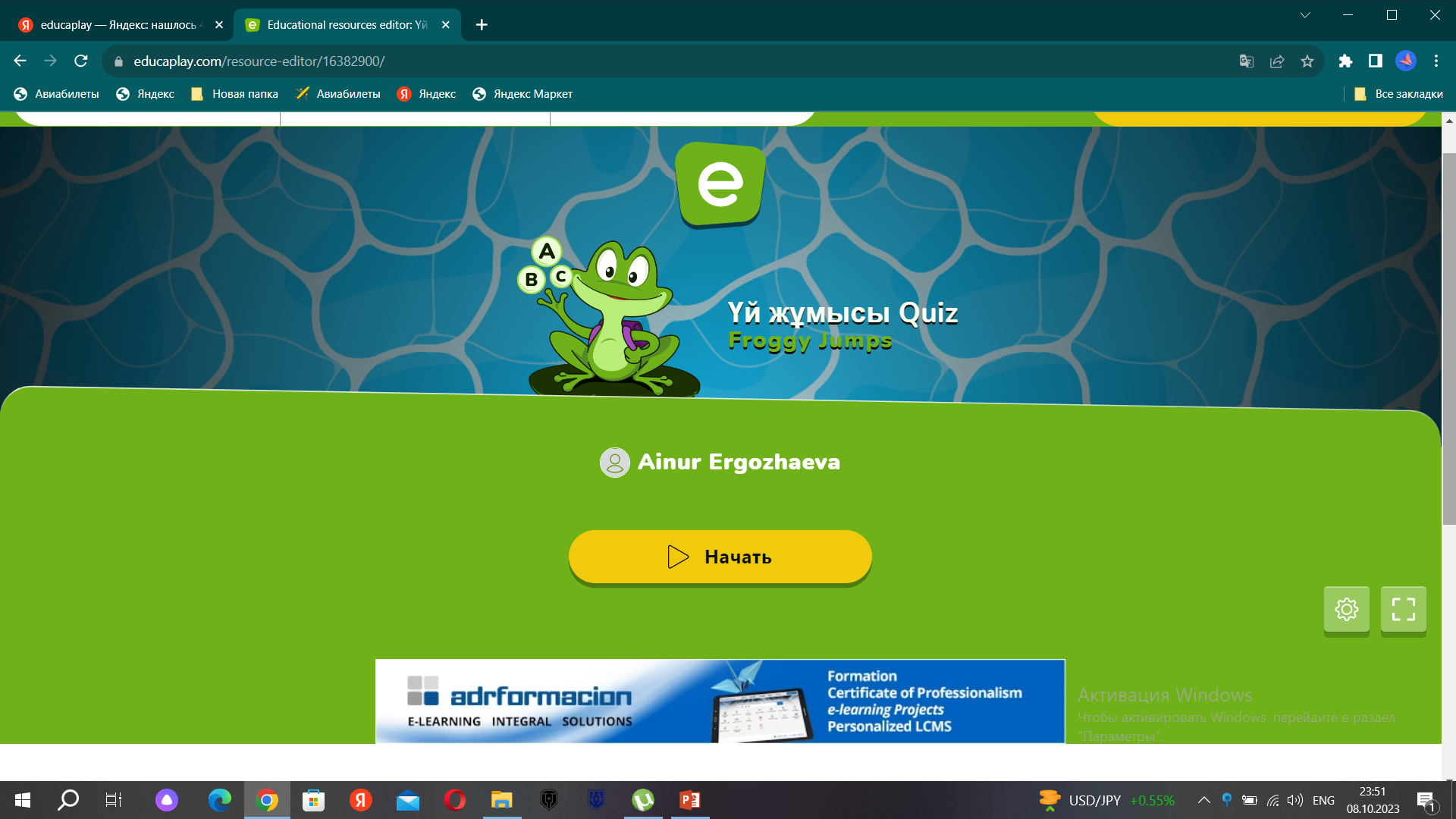 1.Мұғаліммен амандасады. 2.Сабақтың тақырыбын дәптерге жазады. 3.Сабақтың мақсаттарымен танысады. 4.Еducaplay.comда жауап береді 5.Бағалайды. |