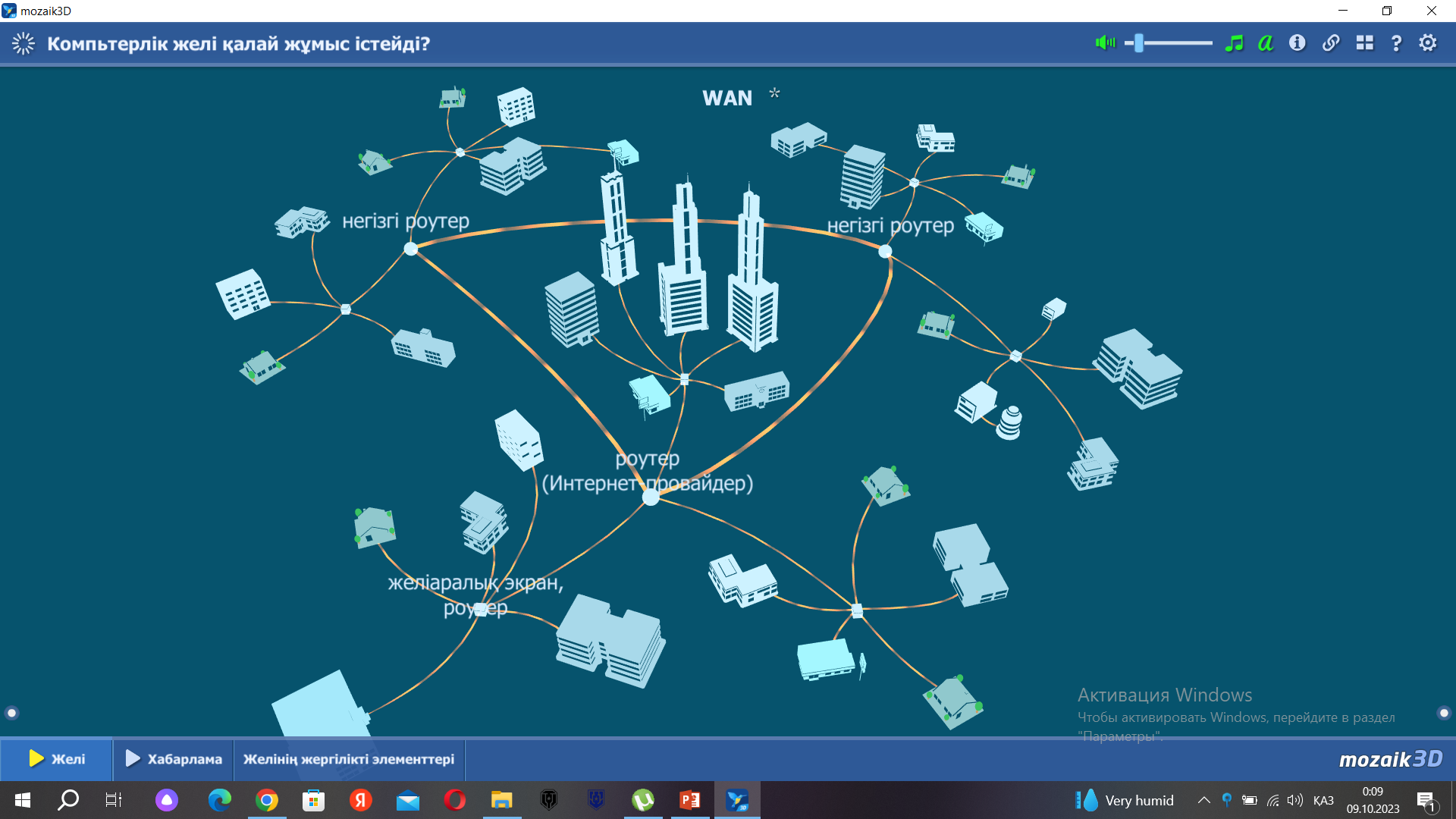 Жаңа сабақтың мазмұнын ашу үшін бейне сабақты көрсетемін, тақырыпқа байланысты диалог құрамын. Оқулықпен жұмыс Топтық жұмыс 1- топ. Аумақтық таралуына; тиістілігіне деректерді тасымалдау жылдамдығы жайлы мәлімет жинау 2-топ . Деректерді тарату ортасына байланысты; кабельдік арналар; сымсыз желі жайлы мәлімет жинау 3 д галериясына саяхат «Компьютерлік желінің» жұмысы 1-Тапсырма . Жұптық жұмыс Элементтерді анықтамаларымен сәйкестендіреді