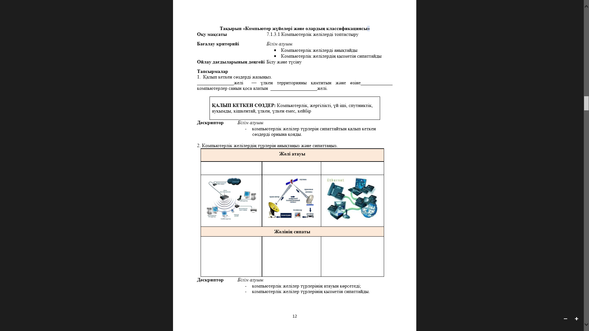 ҚАЛЫП КЕТКЕН СӨЗДЕР: Компьютерлік, жергілікті, үй іші, спутниктік, ауқымды, кішкентай, үлкен, үлкен емес, кейбір Дескрипторлар: Білім алушы - компьютерлік желілер түрлерін сипаттайтын қалып кеткен сөздерді орнына қояды. Тапсырма 2. Компьютерлік желілердің түрлерін анықтаңыз және сипаттаңыз.