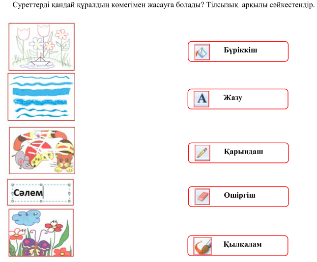3.2.2.1 қарапайым графикалық редактор құралдарын қолдану 3.1.2.2 компьютерлік программаларда файлдарды ашу және сақтау командаларын пайдалану 3.1.2.1 компьютерлік программалар қолданушының міндеттерін шешу үшін қажет екенін түсіндіру |
