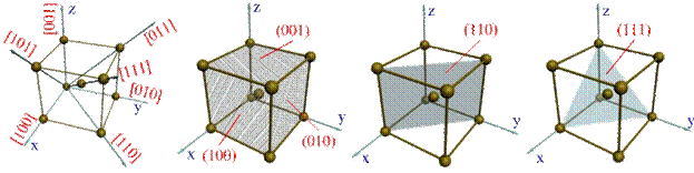 Ох бағытының және оған параллель бағыттардың индекстері [100] деп белгіленеді. Тиісінше, OY және OZ бағыттары [010] және [001] деп белгіленеді. Бет диагональдары бойымен кристаллографиялық бағыттар