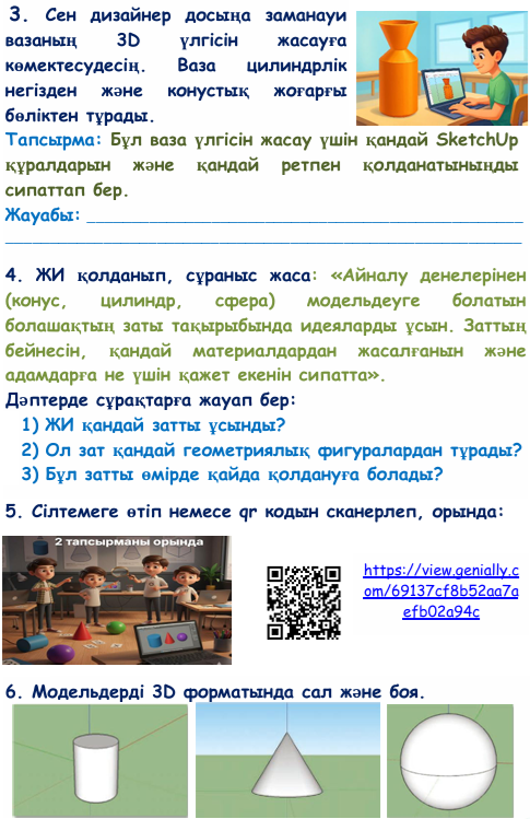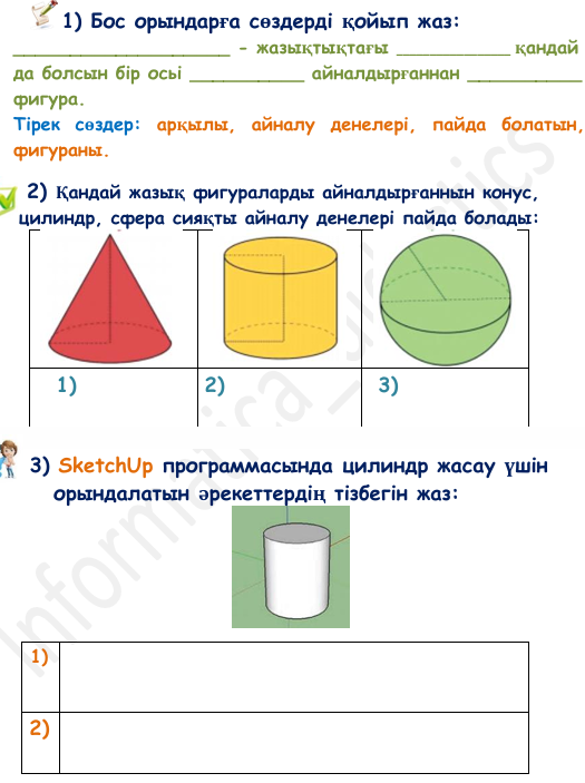 Оқушыларға SketchUp бағдарламасының құралдарын қолдана отырып, пішінін, өлшемін және орнын өзгерту арқылы айналу денелерін (цилиндр, конус, сфера) құруға және түрлендіруге үйрету. |