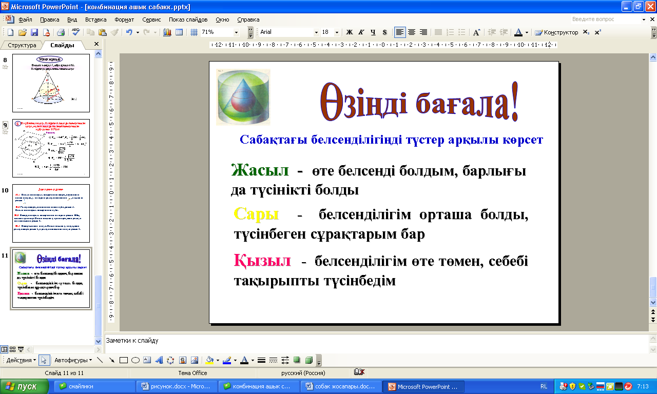 ІІІ. «Миға шабуыл» стратегиясы. Өтілген материалдар бойынша қайталау сұрақтарына жауап беру: (8 мин) 1. Цилиндр дегеніміз не? 2. Цилиндрдың қандай элементтері бар? 3. Цилиндрдың радиусы дегеніміз не? 4. Цилиндрдың осі дегеніміз не? 5. Цилиндрдың биіктігі дегеніміз не? 6. Цилиндрдың жасаушысы дегеніміз не? 7. Цилиндрдің түрлері? 8. Цилиндрдің жазбасы қалай пайда болады? Дұрыс жауап бергеннен кейін тақтада әр түрлі құрылғылардың суреттері шығады. -Балалар бәрің экранға назар аударыңдар. -Ненің суретін көріп тұрсыңдар? -Бұл суреттер қандай денеге ұқсайды? -Конус жайлы не айтуға болады? Бағалау. Әрбір дұрыс жауапқа 10 ұпайдан беріледі. ІІІ. Жаңа сабақты меңгерту. (15 мин) І. Конустың түрлері және элементтерімен таныстыру Тік бұрышты үшбұрыштың оның бір катеті жатқан түзуден айналдыру арқылы алынған фигураны конус деп атайды. Дөңгелек – конустың табаны Конустың биіктігі- конус төбесінен оның табан жазықтығына түсірілген перпендикулярдың ұзындығы. Конустың төбесі мен шеңбердің центрі арқылы өтетін түзу- конустың осі деп аталады. Конус төбесі мен оның табанындағы шеңбердің кез келген нүктесін қосатын кесінді конустың жасаушысы деп аталады. Табанының радиусы- конустың радиусы.