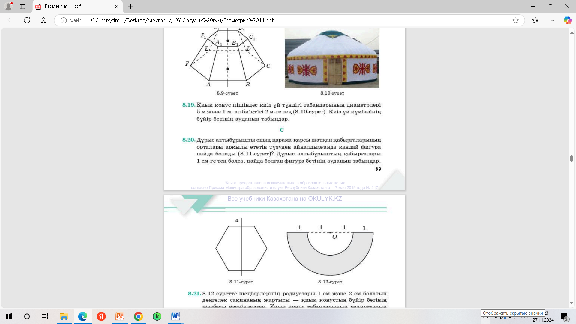 11.3.4 - айналу денелерінің (цилиндр, конус, қиық конус, шар) элементтерін табуға есептер шығару; 11.3.7 - қиық конустың бүйір жəне толық беті аудандарының формулаларын есептер шығаруда қолдану;