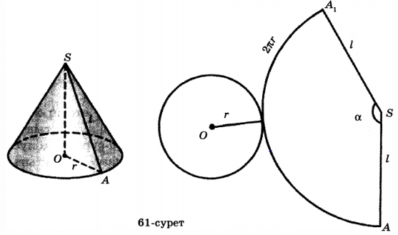 Конус және оның элементтері. Конустың жазбасы, бүйір және толық бетінің аудандары
