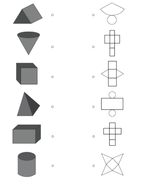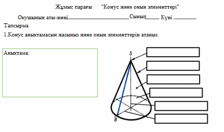 Оқушылар берілген геометриялық денелердің, конустан басқа, жазбаларын біледі. Конус пен оның жазбасы сәйкестендірілмей қалады. Оқушыларға конустың жазбасын дәптерлеріне салуды ұсыныңыз.