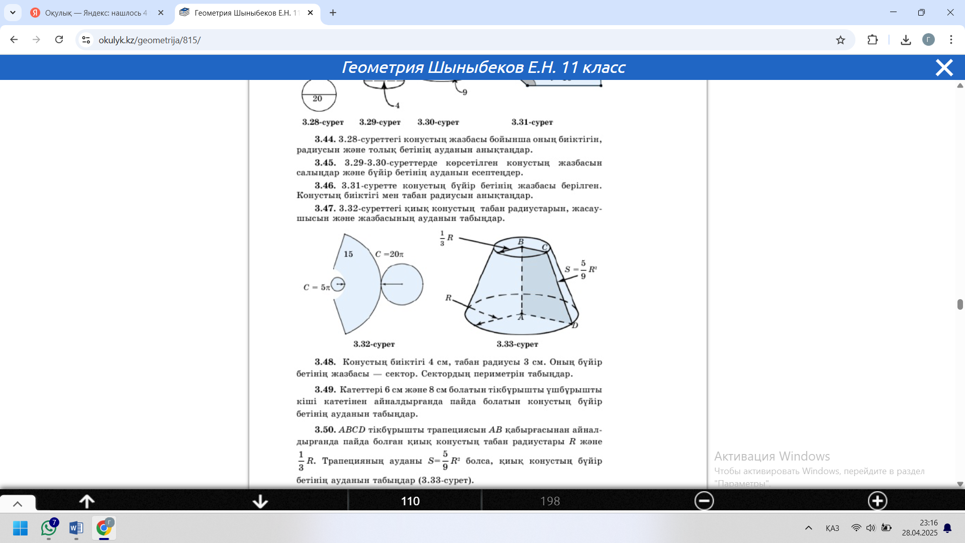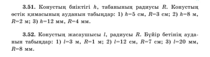 Конус және оның элементтері. Конустың жазбасы, бүйір және толық бетінің аудандары.