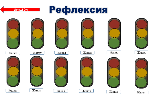 Рефлексия: «Бағдаршам» әдісі. Оқушылар тақтаға шығып өздері белгілейді. |