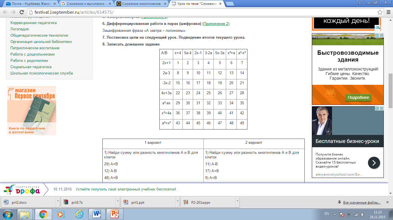 Бірінші топ алғашқы төрт тапсырманы, екінші топ кейінгі бес тапсырманы. Үшінші топ алғашқы бес тапсырманы, төртінші топ кейінгі бес тапсырманы Бағалау: Оқушылар өздерінің орындаған жұмыстарының нәтижесін дұрыс немесе дұрыс еместігін нәтижесінде шифрлеудің нәтижесінде «көпмүше» сөзінің орысша және ағылшынша аударамасын алғаннан кейін түсінеді. М Оқушылардың орындаған жұмыстарына кері байланысын беру;