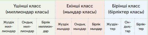 Жаңа сабақ тақырыбын таныстыру: «Көптаңбалы сандар» Сабақ мақсатын хабарлау: Бүгінгі сабақта көптаңбалы сандардың құрылу жолын түсініп, натурал сандар қатарындағы 1 000 000 көлеміндегі санның орнын анықтауды үйренетін боласыңдар. Жаңаны ашу Көптаңбалы сандарды дұрыс жазып үйрену үшін оларды кластарға бөліп үйренуіміз керек. Көптаңбалы сандарды үш класқа бөлеміз. Санды оң жағынан бастағанда 1-клас – БІРЛІКТЕР, 2-клас – Мыңдықтар, 3-клас - МИЛЛИОНДАР класы. Әр клас 3 раязрядқа бөлінеді. Оны түсіну үшін кестеге назар аудар.