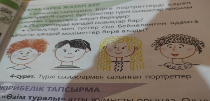 Бірге портреттердіқарап шығыңдар.Бұл суреттер түрлі сызықтар арқылы салынған. Срақтарға жауап беру. Портреттерде қандай сызықтар бар? Сызықтар мен түстер сол бейнеленген адамға қатысты қандай мәліметтер бере алады:?.