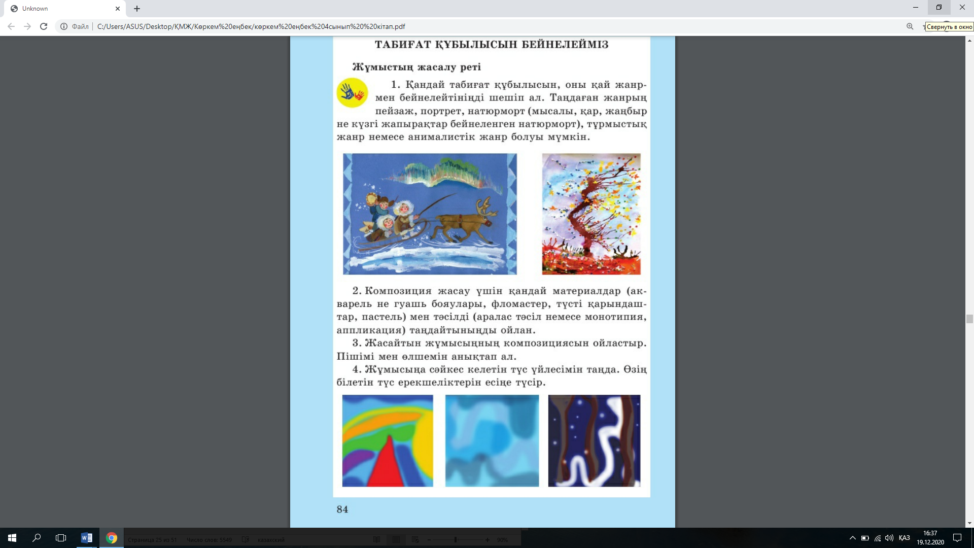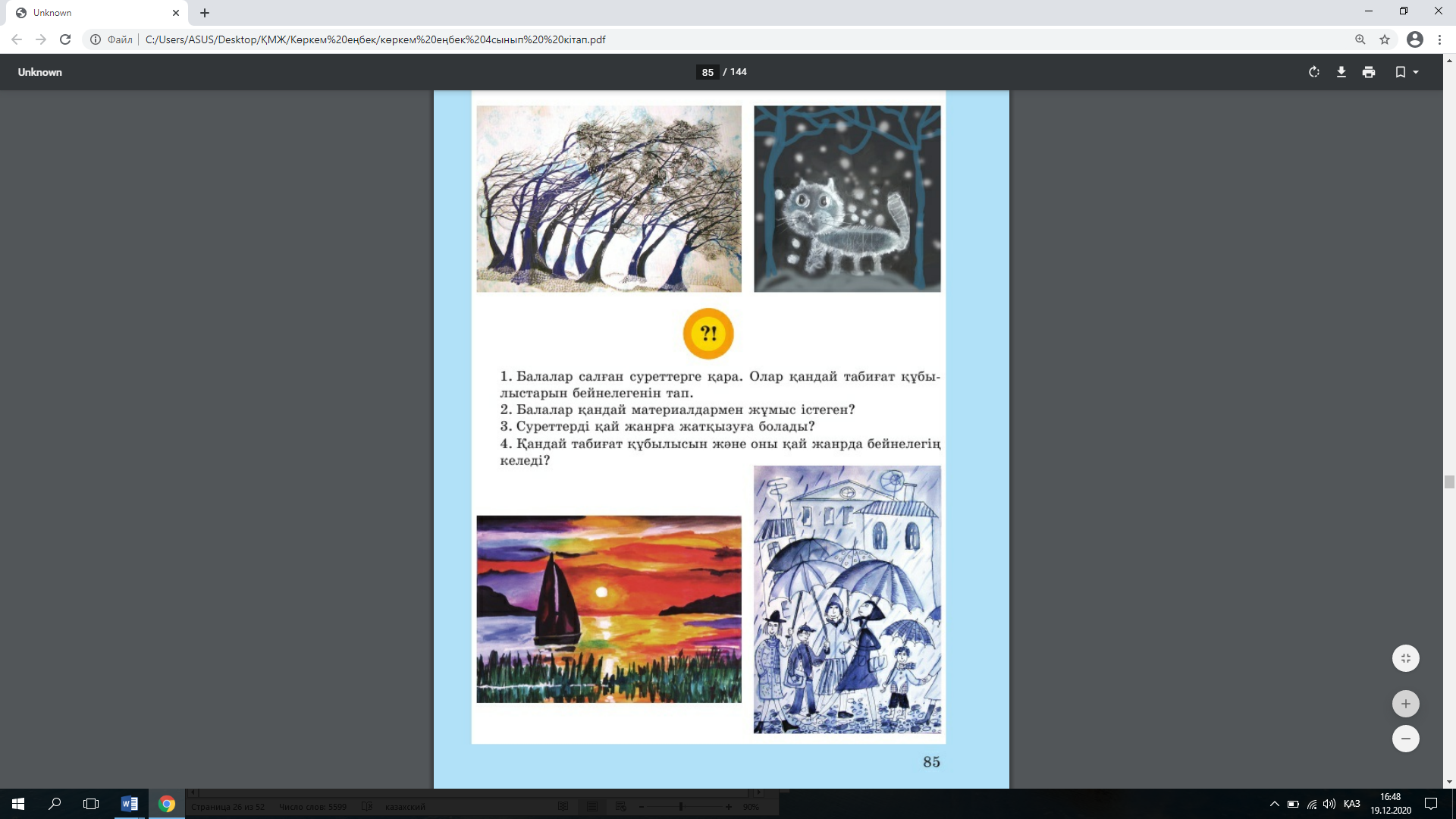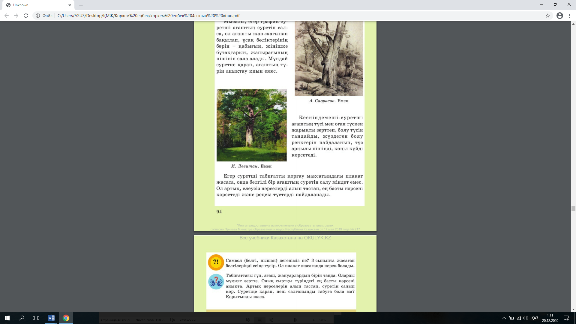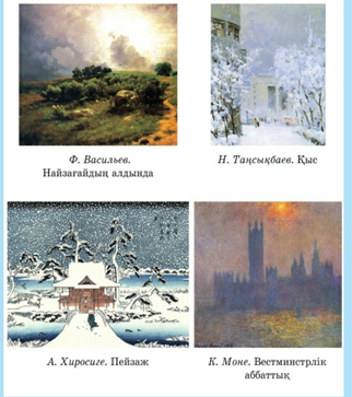 Оқулықта берілген суретшілер туындыларындағы пейзаждармен танысып, сұрақтарға жауап бер. |