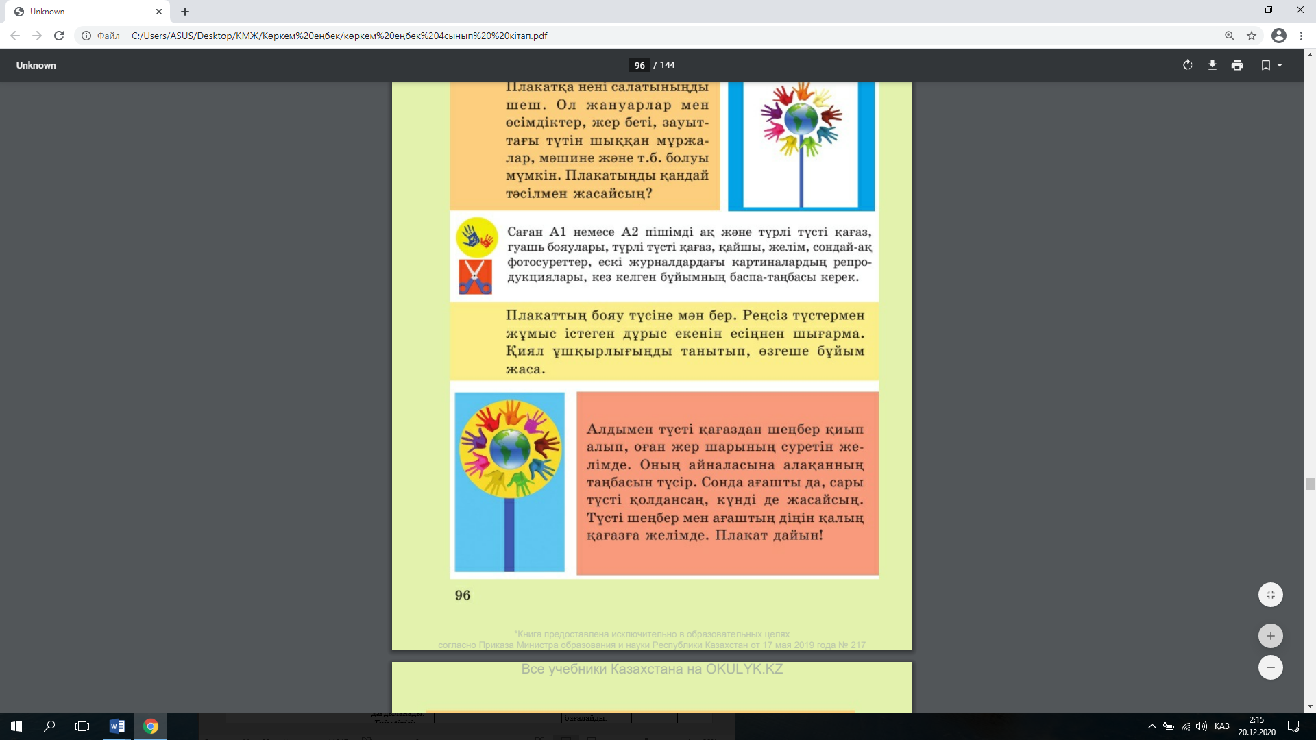 2-Тапсырма.: Қандай плакат жасайтыныңды ойлан.Плакатқа нені салатыныңды шеш. Саған А1 немесе А2 пішімді ақ және түрлі түсті қағаз, гуашь бояулары,түрлі түсті қағаз,қайшы,желім, сондай-ақ фотосуреттер, ескі журналдардағы картиналардың репродукциялары, кез келген бұйымның баспа-таңбасы керек.Плакаттың бояу түсіне мән бер. Қиял ұшқырлығыңды танытып, өзгеше бұйым жаса.