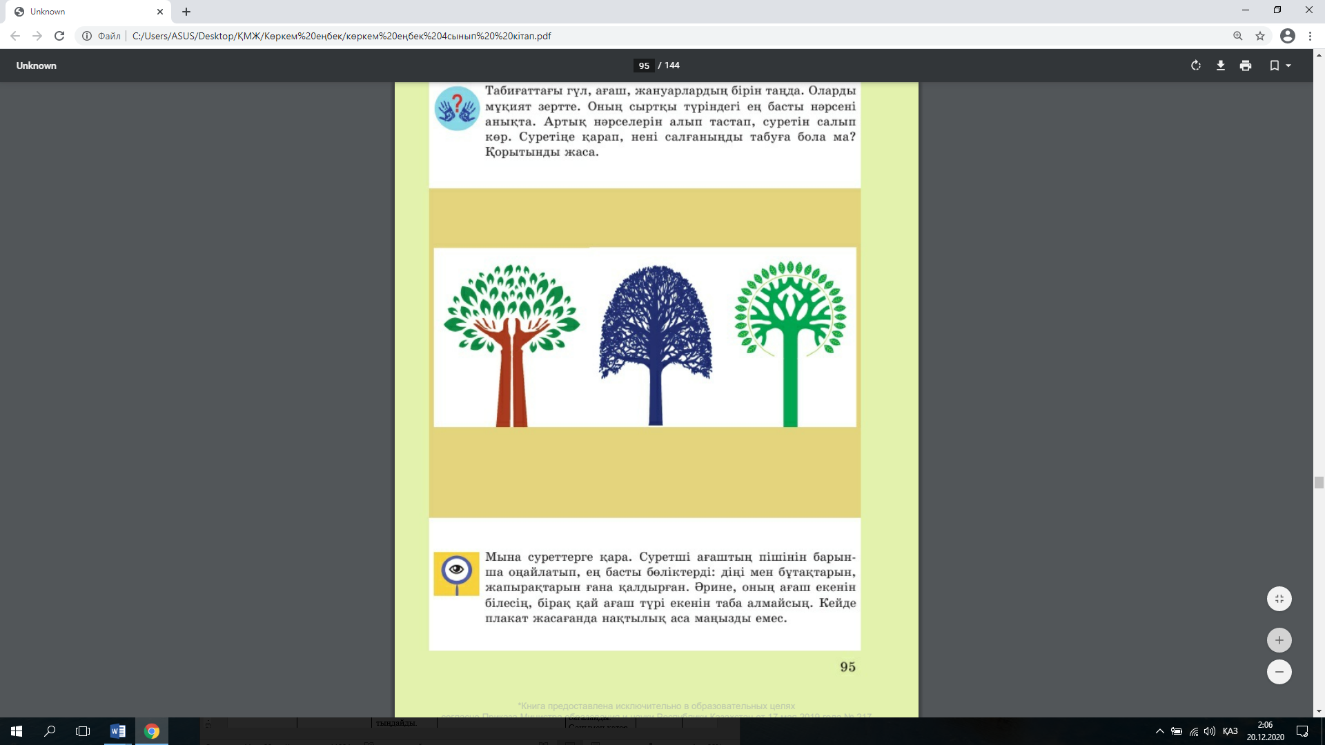 -Тапсырма: Мына суреттерге қара.Суретші ағаштың пішінін барынша оңайлатып, ең басты бөліктерді: діңі мен бұтақтарын,жапырақтарын ғана қалдырған. Әрине, оның ағаш екенін білесің, бірақ қай ағаш түрі екенін таба алмайсың. Кейде плакат жасағанда нақтылық аса маңызды емес. .