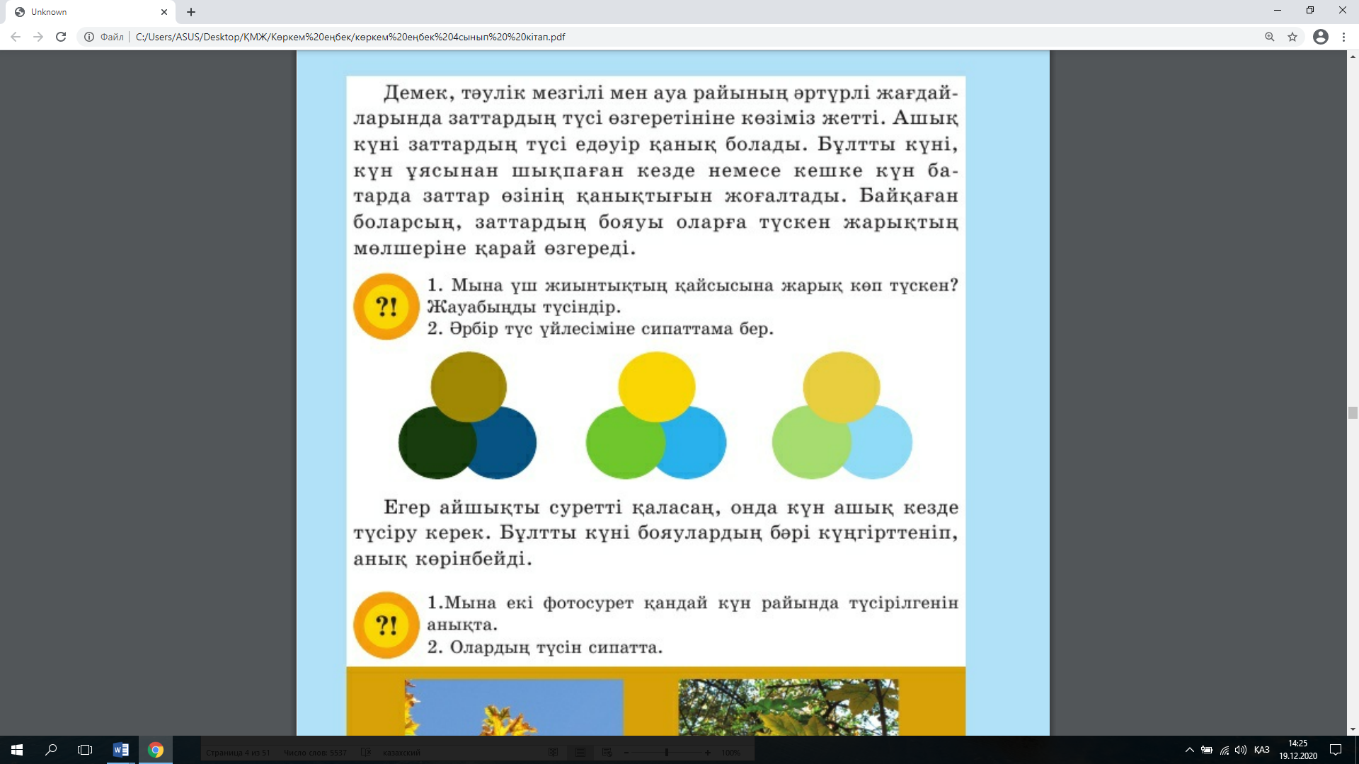 1 .Жылы және суық түстер қандай сезімге бөлейтінін есіңе түсір. 2.Тәуліктің қай мезгілінде жарық көп түседі, ал қай кезде аз түседі? 3.Қанық және қанық емес түстер арқылы ненің суретін салуға болатынын есіңе түсір |