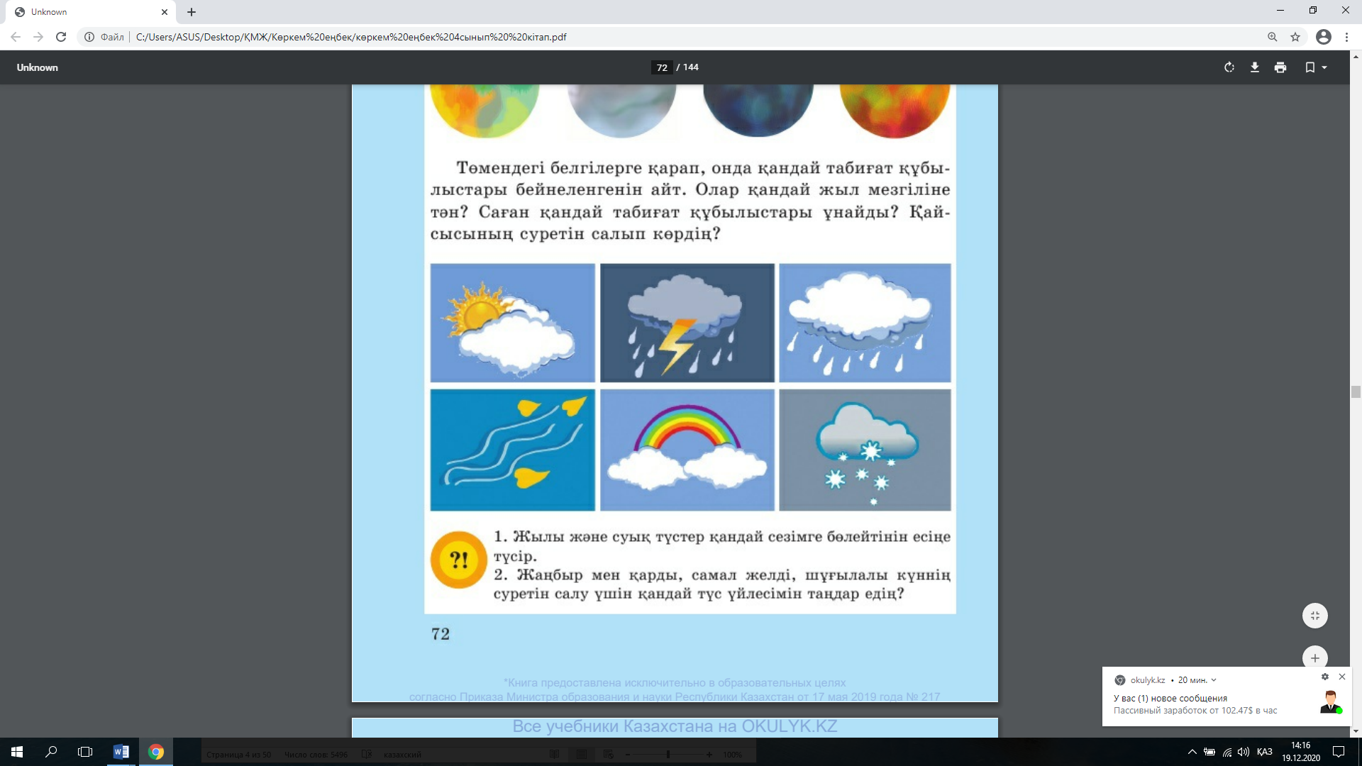 1 Адамға қандай табиғат құбылыстары қауіп төндіреді? 2.Қандай жыл мезгілдерін білесің? 3.Дүниетану сабағынан табиғат құбылыстары туралы не білдің? Саған қандай табиғат құбылыстары ұнайды? |